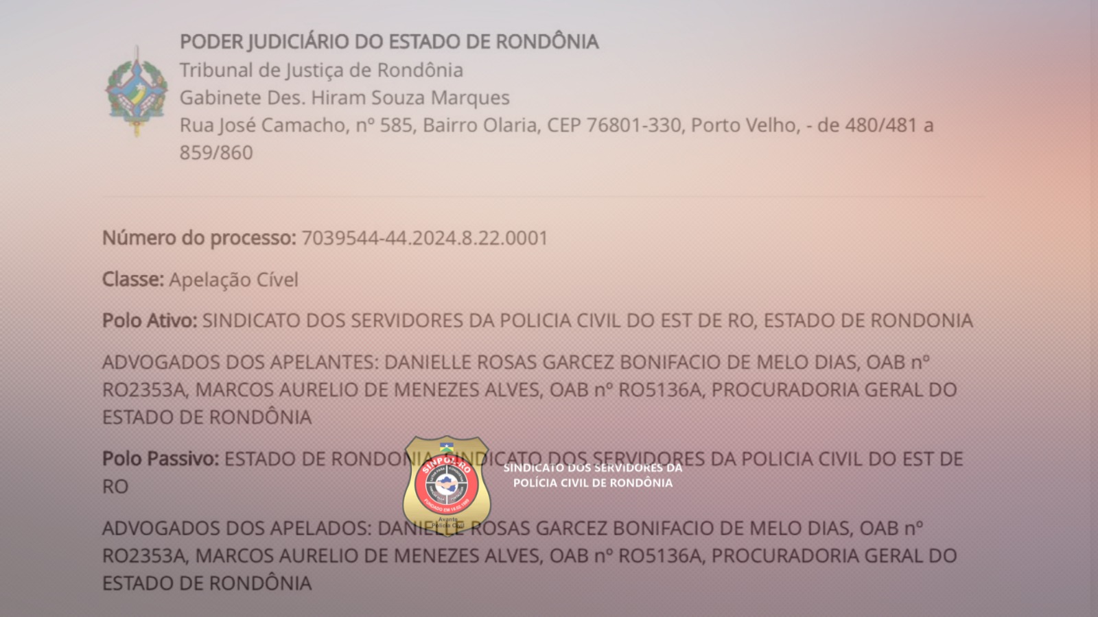 SINPOL / RO - VITÓRIA! TJRO mantém decisão que determina atualização de adicionais pagos a servidores da Polícia Civil de Rondônia